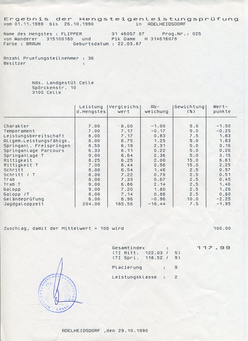 Származása apai ágon Wandere-Wagner-Wendekreis. Anyai ágon kiemelkedik Pik König és Pik As. Eredményes díjlovagló és díjugrató volt amíg versenyzett. Cellében 1989.11.01. és 1990.10.26. között teljesítette az úgy nevezett 300 napos méntesztet amelyet 117,99 ponttal abszolvált( az átlag érték 100 pont volt és 90 ponttól már sikeresnek minősült a vizsga), ezzel megszerezte a fedezési engedélyt a hannoveri fajtában Itt látható.